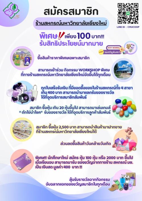 2. พิเศษ!!! นักศึกษาใหม่ สมัคร หุ้น 100 หุ้น หรือ 2000 บาท ขึ้นไป เมื่อเรียนจบ สามารถมารับ ของขวัญจากทางร้าน สหกรณ์ มช. เป็น เงินสด มูลค่า 400 บาท !!! ( เฉพาะ นักศึกษาใหม่ ปี 68 เท่านั้น )