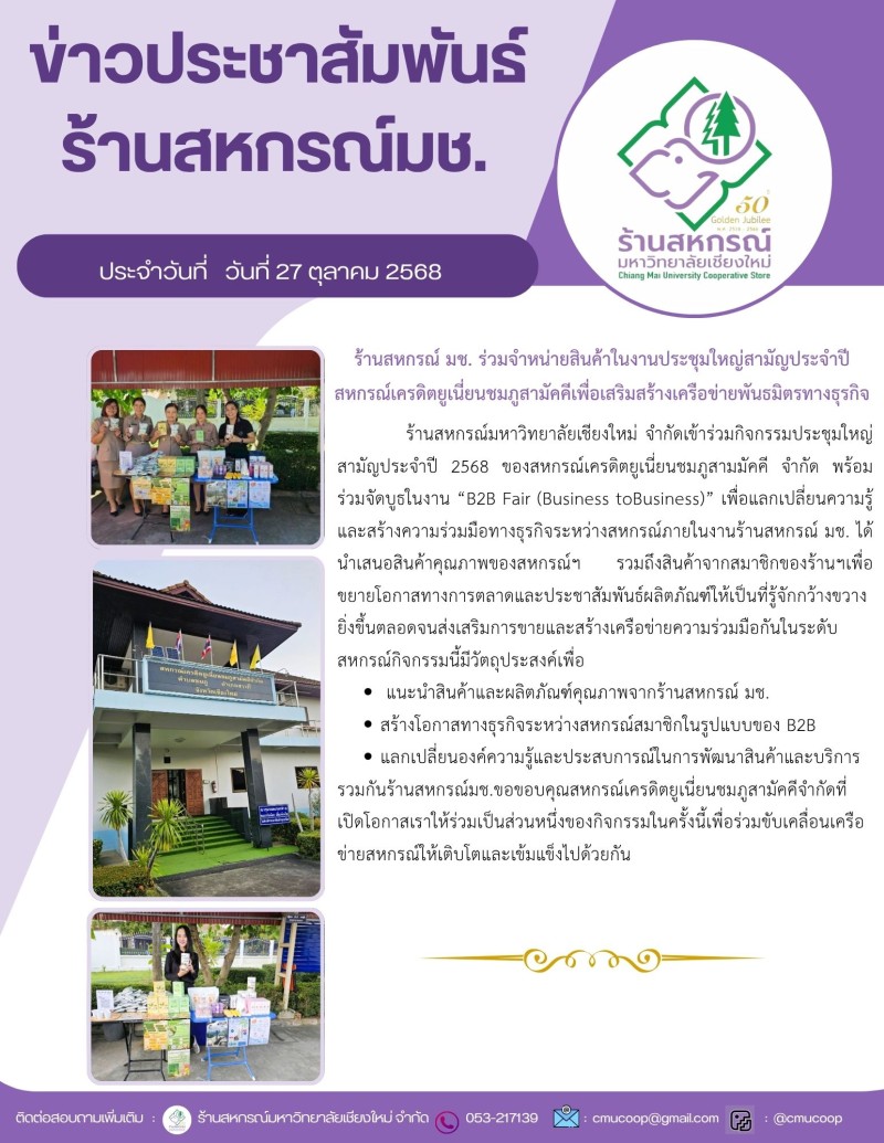 ร้านสหกรณ์ มช. ร่วมจำหน่ายสินค้าในงานประชุมใหญ่สามัญประจำปี สหกรณ์เครดิตยูเนี่ยนชมภูสามัคคีเพื่อเสริมสร้างเครือข่ายพันธมิตรทางธุรกิจ