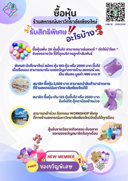 2. พิเศษ!!! นักศึกษาใหม่ สมัคร หุ้น 100 หุ้น หรือ 2000 บาท ขึ้นไป เมื่อเรียนจบ สามารถมารับ ของขวัญจากทางร้าน สหกรณ์ มช. เป็น เงินสด มูลค่า 400 บาท !!! ( เฉพาะ นักศึกษาใหม่ ปี 68 เท่านั้น )